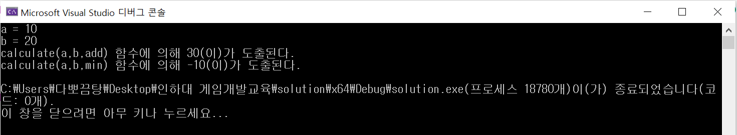 return pt(a, b); // pt()함수를 리턴한다. calculate 함수의 세 번째 매개변수가 add()함수라면 add(a,b)를 리턴한다.