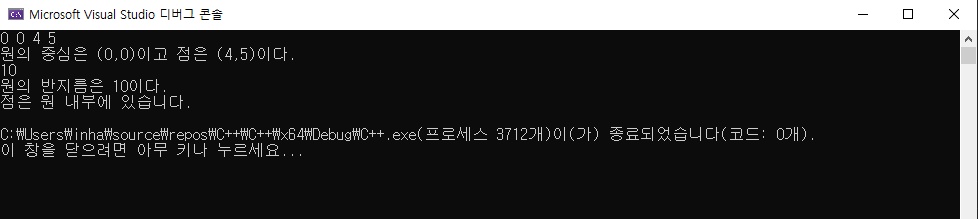 [C++] 점이 원 안에 있는지 판별하는 프로그램 본문