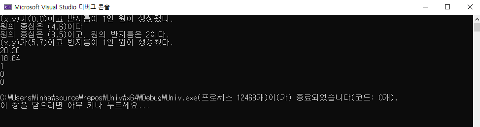 Circle2D circle2(5, 7, 1); // 클래스 객체2 생성, 동시에 인수를 가지고 있는 생성자도 호출된다. (x,y,radius)