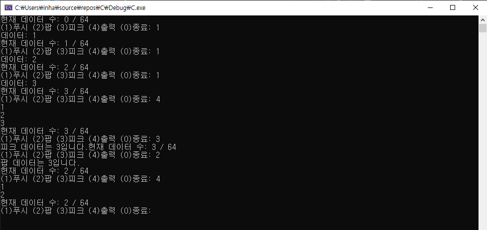 cout << "현재 데이터 수: " << Size(&s) << " / " << Capacity(&s) << endl;
