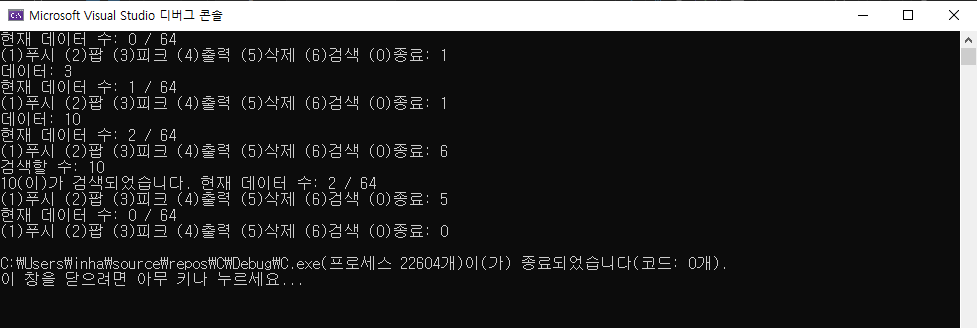 cout << "(1)푸시 (2)팝 (3)피크 (4)출력 (5)삭제 (6)검색 (0)종료: ";