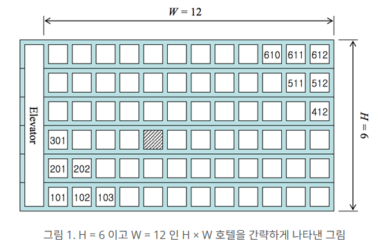 문제를 단순화하기 위해서 호텔은 직사각형 모양이라고 가정하자. 각 층에 W 개의 방이 있는 H 층 건물이라고 가정하자 (1 ≤ H, W ≤ 99). 그리고 엘리베이터는 가장 왼쪽에 있다고 가정하자(그림 1 참고). 이런 형태의 호텔을 H × W 형태 호텔이라고 부른다. 호텔 정문은 일층 엘리베이터 바로 앞에 있는데, 정문에서 엘리베이터까지의 거리는 무시한다. 또 모든 인접한 두 방 사이의 거리는 같은 거리(거리 1)라고 가정하고 호텔의 정면 쪽에만 방이 있다고 가정한다.